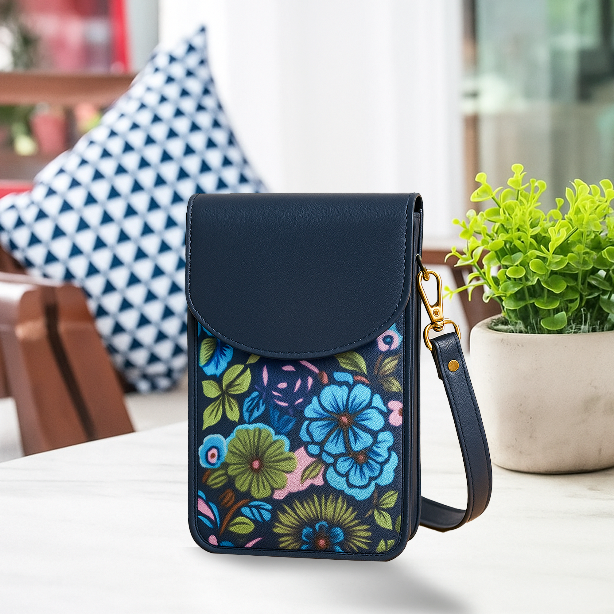 Women's Hand-Painted Floral Phone Wallet with Blue Strap